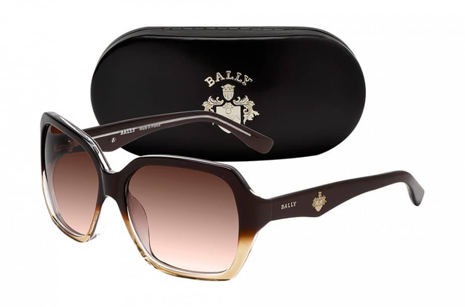 Packshot d’une paire de lunettes de soleil Bally photographiée avec son étui. Composition sur fond blanc.